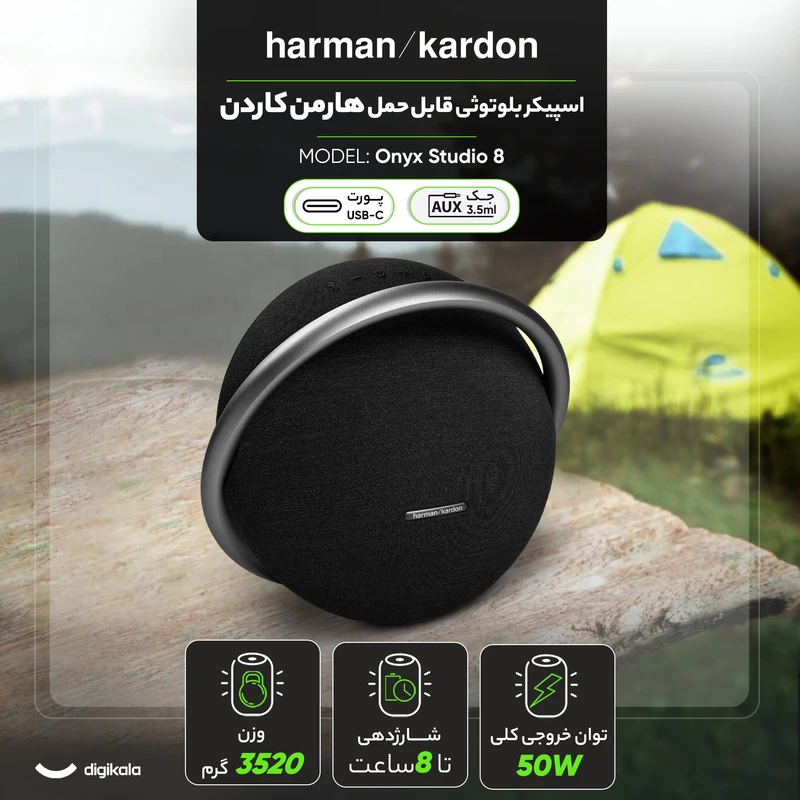 اسپیکر هارمن کاردن Onyx Studio 8 یک اسپیکر بلوتوث قابل حمل با صدای بسیار با کیفیت و طراحی زیبا است. این اسپیکر با بلوتوث 5.2 که دارای قابلیت پشتیبانی از اپلید است، ارتباط با دستگاههای مختلف از جمله تلفن همراه، تبلت و لپ تاپ را برقرار میکند. صدای این اسپیکر با تکنولوژی Harman Kardon’s Signature محصولی از کیفیت صدای فوق العاده است که امکان پخش موسیقی با کیفیت HD را داراست. این اسپیکر دارای باتری با ظرفیت 3250 میلیآمپر ساعت است که به راحتی میتوانید تا 8 ساعت به موسیقی علاقهمند باشید. طراحی این اسپیکر همچنین بسیار زیبا و شیک است. طراحی قوی و مقاوم این اسپیکر به همراه دو درگاه صدا و ورودی AUX امکان استفاده از آن را در محیطهای مختلف فراهم میکند. در کل، اسپیکر هارمن کاردن Onyx Studio 8 یکی از بهترین اسپیکرهای بلوتوث قابل حمل با کیفیت صدای عالی و ظاهری شیک و زیباست.