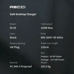 شارژر رومیزی فست شارژ 100W GaN رسی مدل RC39 از نوین ترین تکنولوژی ها و مرغوب ترین متریال در ساخت بهره می برد و دارای قابلیت ها و مزایای فراوانی است که به تفصیل در زیر در مورد آن توضیح می دهیم.