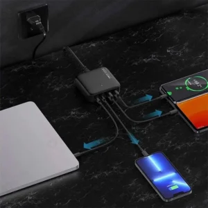 پورت ورودی این شارژر 2 پین است که به وسیله کابل مخصوص و با پلاگین 3 پین استاندارد بریتانیا به پریز متصل می شود. پورت های خروجی این شارژ 4 عدد است و در سمت دیگر آن قرار دارد. با توجه به ابعاد و طرز قرار گیری این شارژر بر روی میز از پایه های سیلیکونی در زیر آن قرار داده شده است. در قسمت رویی این محصول یک نشانگر LED نیز موجود می باشد.