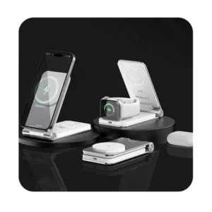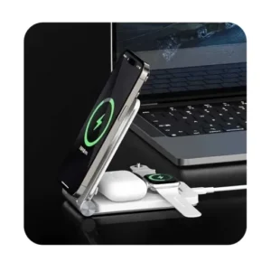 شارژر وایرلس اپل سهکاره مکسکو دارای طراحی خاصی است که میتواند بهراحتی تا شده و به حالت جمعشده درآید. این ویژگی به شما این امکان را میدهد که در مواقعی که از دستگاه استفاده نمیکنید، آن را جمع کرده و فضای کمی اشغال کند.