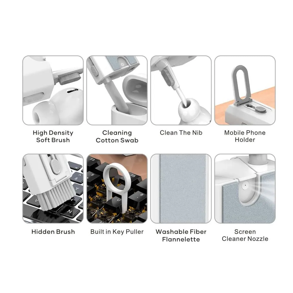 داراي مخزن اسپري مواد تميز كننده، پارچه قابل شست و شو تميز كننده صفحه نمايش از ميكرو فايبر، داراي سري پنبه اي جهت زدودن گرد و خاك داخل كيس ايرپاد، برس تميز كننده با تراكم بالا، داراي نوك فلزي جهت تميز كردن داخل گوشي، داراي نگهدارنده تلفن همراه، داراي برس مخفي جهت تميز كردن صفحه كليد داراي ابزار در آوردن كليد هاي صفحه |