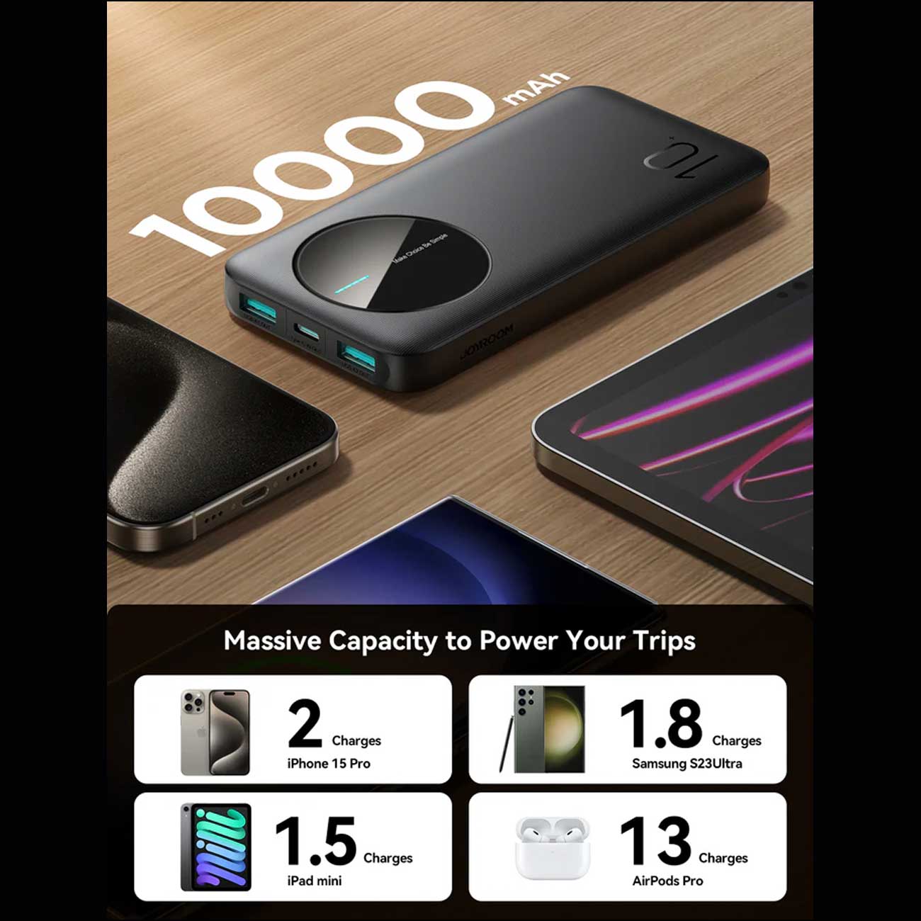 پاوربانک جیبی جویروم سه درگاه که شامل یک پورت Type-C و دو درگاه USB است برای آن در نظر گرفته شده و قابلیت شارژ طیف گستردهای از دستگاهها مانند انواع برندهای تلفنهای هوشمند و تبلتها، پنکه دستی شارژی، چراغ قوه شارژی، کنسول بازی و … را دارد.